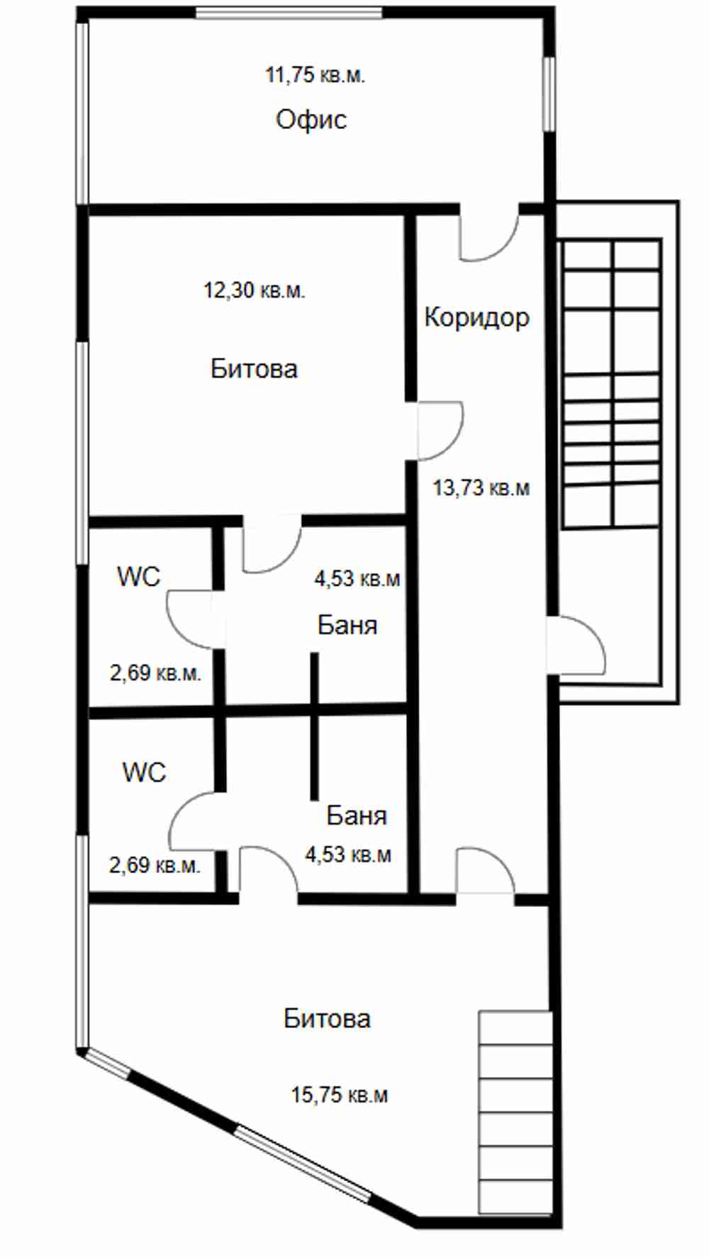 Втори етаж: Директорски офис, помещения за персонала, бани с тоалетни и съблекални. Подовите настилки са от гранитогрес, а стените са боядисани с латекс.